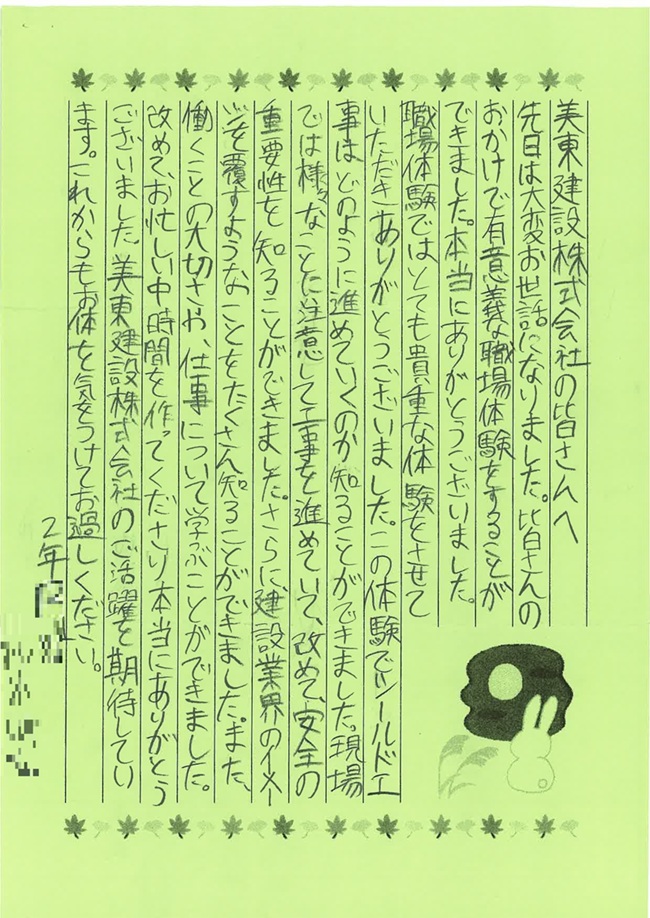 令和7年9月17、18、19日の3日間 練馬区立石神井西中学校から2学年の生徒2名の職場体験学習の受け入れを行いました。